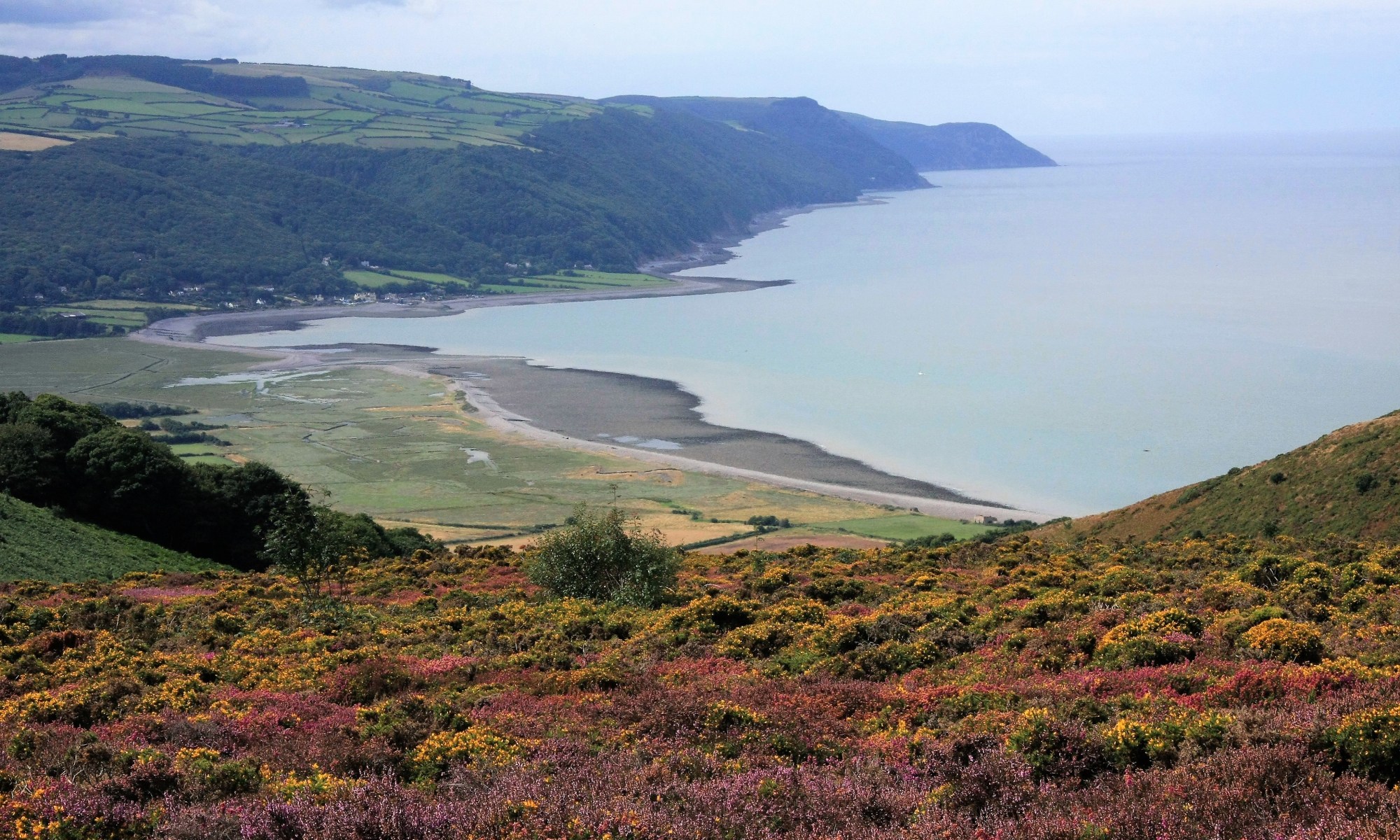 This is a special place. I am standing on a hill above Porlock Vale, delighting in some of the many contrasts of Exmoor. Moorland spills into the sea. Farmland tumbles down towards the cliffs. Houses are held in the embrace of forests. Two kinds of summer heather jostle for attention. The yellow gorse, just past its peak, aggressively guards its position. The Bristol Channel, with the second largest tidal range in the world, re-arranges the beach on a daily basis.
